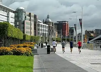 The Tradeston Bridge, completed in 2009, allows quick access by foot or bicycle over the Clyde between the IFSD and the Tradeston district, a feature which was previously lacking from the area requiring pedestrians to make an 800 metres (875 yd) detour via the George V Bridge to reach the same point.