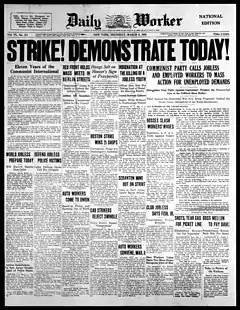 - "World Jobless Demonstrations in All Capitalist Lands Fight for Demands, Against Bosses: Workers, Jobless Clash in Berlin, London, Dublin, Manchester, Vienna, Halle, Hamburg, Munich, Bucharest, and Elsewhere," Daily Worker [New York], vol. 6, no. 312 (March 7, 1930), pp. 1, 3.