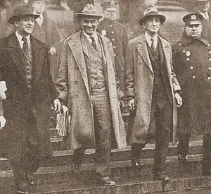 During hasty negotiations with CPUSA leader William Z. Foster, New York City Police Commissioner Grover Whalen refused to allow a procession of the Union Square gathering to city hall on the grounds that no parade permit had been obtained.[7] Foster took to the rostrum to inform the crowd that the right to march was being denied and demanded of the gathering, "Will you take that for an answer?"[8] The crowd vehemently responded in the negative, and Foster immediately began leading an impromptu march down Broadway to City Hall.[9]