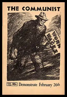 The Communist Party USA (CPUSA) prepared for the March 6 actions with agitational meetings and leaflets, over 1 million of which were circulated in anticipation of the event.[5] The party made use of two primary mobilizing slogans to motivate participation and to generate enthusiasm for the event: "Work or Wages!" and "Don't Starve — Fight!"[6] The demonstrations were to be conducted under the auspices of the party's trade union adjunct, the Trade Union Unity League (TUUL).[5]