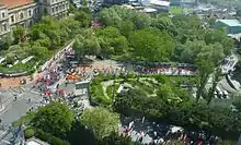 Unions and radical organizations including anarchist groups and socialist and communist parties have kept the international May Day tradition alive with rallies and demonstrations. In 1919 especially large demonstrations took place, and violence greeted the normally peaceful parades in Boston, New York, and Cleveland and a number of people were killed.[64][65] In Milwaukee, an annual commemoration takes place at the site of the killing of seven workers during an 8 hour march.[14] Some of the largest examples of this occurred during the Great Depression of the 1930s, when hundreds of thousands of workers marched in May Day parades in New York's Union Square, while cities like Chicago and Duluth saw large demonstrations organized by the communist party.
