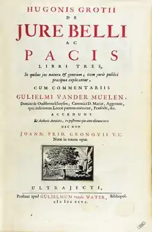 The Dutch jurist Hugo Grotius (1583–1645) is widely regarded as the most seminal figure in international law, being one of the first scholars to articulate an international order that consists of a "society of states" governed not by force or warfare but by actual laws, mutual agreements, and customs.[22] Grotius secularized international law and organized it into a comprehensive system; his 1625 work, De Jure Belli ac Pacis (On the Law of War and Peace), laid down a system of principles of natural law that bind all nations regardless of local custom or law. He also emphasized the freedom of the high seas, which was not only relevant to the growing number of European states exploring and colonising the world, but remains a cornerstone of international law today. Although the modern study of international law would not begin until the early 19th century, the 16th-century scholars Gentili, Vitoria and Grotius laid the foundations and are widely regarded as the "fathers of international law."[23]