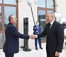 Representatives of countries, including Argentina,[65] Canada,[66] Chile,[67] China,[68] Croatia,[69] Estonia,[70][71] France,[72][73][74] Georgia,[75] Germany,[25] Greece,[76] India,[77][78] Indonesia,[79] Iran,[80][81][82] Kazakhstan,[83] Latvia,[84][85] Lithuania,[86][85] Moldova,[87] Poland,[88] Romania,[89][90] Russia,[73][74][91] Saudi Arabia,[92] the United Kingdom,[93] the United States,[73][74][94] Uruguay,[95] and the Holy See,[25] have called for a peaceful resolution to the conflict. Afghanistan called for an end to Armenian occupation in Nagorno-Karabakh while calling for a cease-fire, urging the parties involved to resolve the long-standing crisis peacefully.[96] Bosniak member of the Presidency of Bosnia and Herzegovina Šefik Džaferović and the leader of the Party of Democratic Action, Bakir Izetbegović, voiced support for Azerbaijan, condemning Armenia and comparing the situation with the 1992–1995 Bosnian War.[97][98] Cyprus condemned Azerbaijan for breaching the ceasefire and for any escalating actions, calling for a return to peaceful negotiations.[99] After the war, in January 2021, the Ambassador of the United Kingdom to Azerbaijan James L. Sharp, congratulated the Azerbaijani people on their country's victory in the war.[100][101]