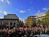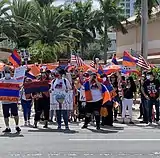 Ethnic Armenian populations around the world have lobbied for peace negotiations.[120] On 1 October, the South Ossetian Armenian community condemned Azerbaijan and Turkey, urging recognition of Artsakh's independence.[121] The next day, Armenians in Samtskhe–Javakheti, in Georgia, expressed concern and their intention to send aid.[122] Subsequently, Georgia closed its border with Armenia, indicating frustration within Georgia's Armenian minority.[123] Croatia's Armenian diaspora's leader asked for support against what she described as a genocide against the Armenians.[124] On 5 October, Armenian Americans protested outside the Los Angeles (LA) CNN building, calling for more accurate coverage.[125] On 11 October, the LA community held a 100,000-person strong protest march to the Turkish Consulate, in tandem with smaller protests in Washington, San Francisco, New York City, Boston and elsewhere in the United States.[126][127] LA's mayor expressed support for Armenia and the city's Armenian community by lighting up City Hall with the Armenian flag's colours.[128][129] A protest was held in Orange Country during President Trump's pre-election rally calling on him to sanction Turkey and Azerbaijan; Trump praised them by saying, "the people from Armenia have great spirit for their country".[130][131] Protests have occurred all over Europe demanding recognition of Artsakh's independence, with the largest rallies held in Paris, France and in front the Council of the European Union in Brussels, Belgium.[132] A major rally was held in Aleppo, Syria by Armenians and Syrians condemning Azerbaijan and Turkey.[133] Armenian communities have also protested globally, notably in Argentina,[134] Australia,[135] Canada,[136] and Uruguay.[137]