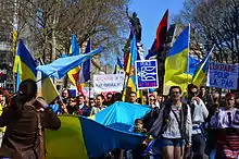 In contrast to the unanimous condemnation by western governmental spokespeople of the Russian role in the conflict, European politicians representing euroscepticism, mainly on the right of the political spectrum, criticised the role of western governments in allegedly precipitating the crisis, in some cases supporting Russian president Vladimir Putin's position.[51][52] Agence France-Presse reported that "From the far right to the radical left, populist parties across Europe are being courted by Russia's Vladimir Putin who aims to turn them into allies in his anti-EU campaign" and that "A majority of European populist parties have sided with Russia over Ukraine."[53] Some of the parties have received Russian support and financing.[54][55] After the May 2014 European parliament election, eurosceptic representation increased in that body from 92 seats to 150 (out of 751). Such opinions were expressed in Britain by Nigel Farage, leader of the UK Independence Party,[56] in France by Marine Le Pen, leader of France's far-right National Front,[57] in Austria by Heinz-Christian Strache, the chairman of the Freedom Party of Austria,[57] in the Netherlands by Geert Wilders,[57] founding leader of the Party for Freedom, and in Italy, Hungary, Slovakia, and Bulgaria. The shoot-down of Malaysia Airlines Flight 17 over the Donbass conflict zone in mid-July moderated these opinions.