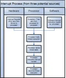 In digital computers, an interrupt is a response by the processor to an event that needs attention from the software. An interrupt condition alerts the processor and serves as a request for the processor to interrupt the currently executing code when permitted, so that the event can be processed in a timely manner. If the request is accepted, the processor responds by suspending its current activities, saving its state, and executing a function called an interrupt handler (or an interrupt service routine, ISR) to deal with the event. This interruption is temporary, and, unless the interrupt indicates a fatal error, the processor resumes normal activities after the interrupt handler finishes.[1]