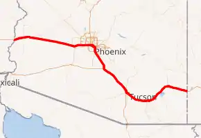 After exiting the Phoenix metropolitan area, I‑10 continues southward into Casa Grande intersecting I‑8 before heading southeast towards Tucson, paralleling the Santa Cruz River. Several projects have occurred recently, including construction of a new exit at Twin Peaks Rd in Marana and widening of I‑10 from Prince Rd to I-19 in Tucson to four lanes in each direction, which was later extended to Ruthrauff Rd/El Camino Del Cerro.[6] After I-10's junction with I-19, I-10 heads southeast towards Benson and Willcox before entering New Mexico.