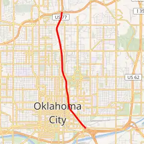 | 0.00 | 0.00 | Southern terminus; southern end of US-77 concurrency; I-35 exit 126, I-40 exit 151B | ||