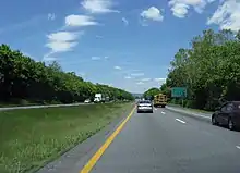 Interstate 270 Spur (referred to as I-270Y by the MDSHA) is a 2.10-mile (3.38 km) spur off I-270 that connects I-270 and the Capital Beltway.[2] It carries traffic headed southbound on I-270 to southbound I-495 and from northbound I-495 to northbound I-270, filling in the missing movements not available at the interchange between I-270 and I-495.[49] The road heads north from I-495 as a six-lane freeway with a 55 mph (89 km/h) speed limit. The left lane in each direction serves as a HOV lane for carpools with 2 or more persons that is in operation between 3:30 and 6:30 p.m. weekdays in the northbound direction and between 6:00 and 9:00 a.m. weekdays in the southbound direction.[2][5][49] I-270 Spur continues north through wooded suburban areas to an interchange with Democracy Boulevard adjacent to the Westfield Montgomery shopping mall.[49] A short distance later, the road has a southbound exit and northbound entrance for the HOV lanes onto Fernwood Road. Past here, I-270 Spur merges into northbound I-270 with separate ramps for the travel lanes and the HOV lanes.[2][49] Before 1975, when I-270 was called I-70S, this road was called I-270, without the word "Spur".