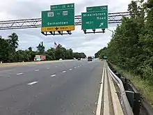 Interstate 270 (I-270) is a 34.70-mile (55.84 km) auxiliary Interstate Highway in the U.S. state of Maryland that travels between I-495 (the Capital Beltway) just north of Bethesda in Montgomery County and I-70 in the city of Frederick in Frederick County. It consists of the 32.60-mile (52.46 km) mainline as well as a 2.10-mile (3.38 km) spur that provides access to and from southbound I-495. I-270 is known as the Washington National Pike, and makes up the easternmost stretch of the Dwight D. Eisenhower Highway.[3] Most of the southern part of the route in Montgomery County passes through suburban areas around Rockville and Gaithersburg that are home to many biotech firms. This portion of I-270 is up to twelve lanes wide and consists of a local-express lane configuration as well as high-occupancy vehicle lanes (HOV lanes) that are in operation during peak travel times. North of the Gaithersburg area, the road continues through the northern part of Montgomery County, passing Germantown and Clarksburg as a six- to eight-lane highway with an HOV lane in the northbound direction only. North of here, I-270 continues through rural areas into Frederick County and toward the city of Frederick as a four-lane freeway.