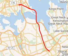 The existing section of the Clearview Expressway that carries the I-295 designation begins at the unfinished interchange with NY 25 where the ramps from northbound NY 24 (212th Street) and southbound Hollis Court Boulevard merge into the northbound and southbound lanes, respectively, of the highway.[5] The Queens section of this roadway is known as "The 77th Infantry Division Expressway".[6] The Queens expressway instantly runs beneath a stack interchange[5] with the Grand Central Parkway[7] before immediately entering Cunningham Park. The Clearview leaves Cunningham Park at the interchange with Long Island Expressway (now I-495).[5]