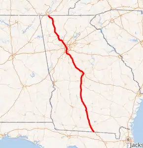 Interstate 75 (I-75) in the U.S. state of Georgia travels north–south along the U.S. Route 41 (US 41) corridor in the central part of the state, traveling through the cities of Valdosta, Macon, and Atlanta. It is also designated—but not signed—as State Route 401 (SR 401).