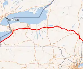 West of Albany, I-90 in New York is designated along the mainline of the New York State Thruway. The Thruway begins at the Pennsylvania state line in Chautauqua County, following the shore of Lake Erie northeast and passes through the town of Cheektowaga, a large suburb of Buffalo directly east of the city. Two auxiliary routes, I-190 (leading to Niagara Falls and connecting into Canada as Ontario Highway 405) and I-290 (a northerly bypass of Buffalo) connect with I-90 here. Both auxiliary routes provide access between I-90 and Canada's largest city, Toronto. East of Erie County, the Thruway turns east and passes through the suburbs of several major cities in Upstate New York, generally following the path of the Erie Canal. It passes south of Rochester and north of Syracuse, which are served by three auxiliary Interstate Highways: I-490 and I-390 connect to Rochester, while I-690 leads to Syracuse.[3] The speed limit, enforced by the New York State Police, is 65 miles per hour along most of this stretch.[4]