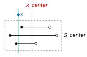We start by taking the entire range of all the intervals and dividing it in half at (in practice, should be picked to keep the tree relatively balanced). This gives three sets of intervals, those completely to the left of which we'll call , those completely to the right of which we'll call , and those overlapping which we'll call .