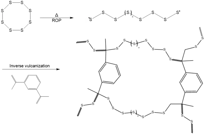 This process is based on a typical property of sulfur which is the catenation. In chemistry, catenation is the bonding of atoms of the same element into a series, called a chain. Hence, from a chemical point of view, the inverse vulcanization is similar to the sulfur-based crosslinking, i.e. vulcanization, of an unsaturated elastomer, such as natural rubber. The product of inverse vulcanization is made by long sulfur linear chains linked together by organic molecules. This is a great (the main) difference with the crosslinking networks arising from vulcanization, which are based on short sulfur bridges, even made by one or two sulfur atoms. The polymerization process consists in the heating of elemental sulfur above its melting point (115.21 °C), in order to favor the ring-opening polymerization process (ROP) of the S8 monomer, occurring at 159°C. As a result, the liquid sulfur is constituted by linear polysulfide chains with diradical ends, which can be easily bridged together with a modest amount of small dienes, such as 1,3-diisopropenylbenzene(DIB),[1] 1,4-diphenylbutadiyne,[2] limonene,[3] divinylbenzene (DVB),[4] dicyclopentadiene,[5] styrene,[6] 4-vinylpyridine,[7] cycloalkene[8] and ethylidene norbornene,[9] or longer organic molecules as polybenzoxazines,[10] squalene[11] and triglyceride.[12] Chemically, the diene carbon-carbon double bond (C=C) of the substitutional group disappears, forming the carbon-sulfur single bond (C-S) which binds together the sulfur linear chains. The huge advantage of such a polymerization is the absence of a solvent (solvent-free): sulphur acts as comonomer and solvent. This makes the process highly scalable at the industrial scale. As evidence, the kilogram-scale synthesis of the poly(S-r-DIB) has been already correctly accomplished.[13]