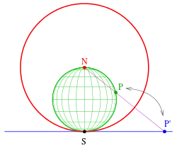 A stereographic projection usually projects a sphere from a point (north pole) of the sphere onto the tangent plane at the opposite point (south pole). This mapping can be performed by an inversion of the sphere onto its tangent plane. If the sphere (to be projected) has the equation (alternately written ; center , radius , green in the picture), then it will be mapped by the inversion at the unit sphere (red) onto the tangent plane at point . The lines through the center of inversion (point ) are mapped onto themselves. They are the projection lines of the stereographic projection.