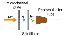 In an ion-to-photon detector, a photomultiplier tube is coated with a layer of scintillator compound, such as Rhodamine B or CsI. When the ions pass through the mass analyzer of the spectrometer, they strike the scintillator compound and cause the release of photons. These photons are then detected by the photomultiplier tube. A conversion dynode, such as a microchannel plate can also be used between the ion beam and the scintillator to increase the signal. An MCP, when struck by an ion, will release electrons which then strike the scintillator.[1]