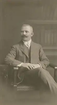 In the same year, he received scholarships from the "Gojdu Foundation"[11] and from the Society "Transilvania"[12] and was admitted to the Oriental Commercial Academy and the Law and Political Sciences School of the Budapest University and attended for the Seminar of higher commercial school professors.[13] In 1900 – 1901 he was drafted and had to interrupt his studies. After his military service, he returned to Budapest, where he passed the fundamental examination in 1902; in 1904 he passed the specialty examination and obtained the Diploma of professor for higher commercial schools.[14][13]