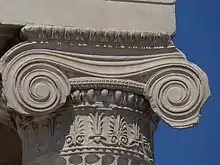 Originally, the volutes lay in a single plane (illustration at right); then it was seen that they could be angled out on the corners. This feature of the Ionic order made it more pliant and satisfactory than the Doric to critical eyes in the 4th century BC: angling the volutes on the corner columns ensured that they "read" equally when seen from either front or side facade. However, some classical artists viewed this as unsatisfactory, feeling that the placement of Ionic columns at building corners required a distortion at the expense of the capital's structural logic; the Corinthian order would solve this by reading equally well from all angles.[3] The 16th-century Renaissance architect and theorist Vincenzo Scamozzi designed a version of such a perfectly four-sided Ionic capital that it became standard; when a Greek Ionic order was eventually reintroduced in the later 18th century Greek Revival, it conveyed an air of archaic freshness and primitive, perhaps even republican, vitality.[4]