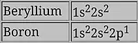 - Moving from the s-block to the p-block: a p-orbital loses an electron more easily. An example is beryllium to boron, with electron configuration 1s2 2s2 2p1. The 2s electrons shield the higher-energy 2p electron from the nucleus, making it slightly easier to remove. This also happens in magnesium to aluminum.[20]