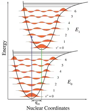Due to the possible changes in molecular geometry that may result from ionization, additional transitions may exist between the vibrational ground state of the neutral species and vibrational excited states of the positive ion. In other words, ionization is accompanied by vibrational excitation. The intensity of such transitions is explained by the Franck–Condon principle, which predicts that the most probable and intense transition corresponds to the vibrationally excited state of the positive ion that has the same geometry as the neutral molecule. This transition is referred to as the "vertical" ionization energy since it is represented by a completely vertical line on a potential energy diagram (see Figure).