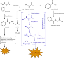 Iproniazid is metabolized in the body. Iproniazid is converted to isopropyl hydrazine and isonicotinic acid in an initial hydrolysis reaction. Isopropyl hydrazine can either be released in the blood or it can be metabolically activated by microsomal CYP450 enzymes.[19] This oxidation of isopropyl hydrazine is a toxification reaction that eventually can lead to the formation of an alkylating agent: the isopropyl radical.[3] Hepatic necrosis was found in rats with doses as low as 10 mg/kg.[19]