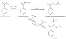 One synthesis pathway involves AcMe which results in the formation of N'-(propan-2-ylidene)isonicotinohydrazide. Subsequently, the C=N linkage is selectively hydrogenated in the presence of a platinum catalyst and with water, alcohol or acetic acid as solvent.[14][15]