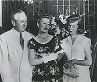 In her retirement, she devoted herself primarily to humanitarianism.[136] Some of the organizations she worked with include the Sister Kenny Foundation,[137] the American Cancer Society[9] (becoming Chairwoman of its Field Army in 1948),[138][139] the Los Angeles Orphanage,[140] the Archdiocesan Council of Catholic Women,[133] and was Co-Chairman of the American Red Cross.[139][9][141] She was elected president of Santa Monica's St. John's Hospital and Health Clinic[140] in 1950[142] and became a board member of Technicolor in 1965, the first woman ever elected to the board of directors.[143][144] She established an African American school for Los Angeles,[145] negotiated donations to St. John's through box office results,[146][147] and Hebrew University Rebuilding Fun's sponsors committee.[133][148] Harold E. Stassen appointed her chairwoman for the American Heart Association's[149][9] women's committee in 1949.[133][145][150] She appeared in a celebrity-rostered television special Benefit Show for Retarded Children (1955)[43] with Jack Benny as host.[151] Dunne also donated to refurbishments in Madison, Indiana, funding the manufacture of Camp Louis Ernst Boy Scout's gate in 1939[152] and the Broadway Fountain's 1976 restoration.[9][153] In 1987, she founded the Irene Dunne Guild, a foundation which remains "instrumental in raising funds to support programs and services at St. John's."[154] It was reported that the Guild had raised $20 million by the time of her death.[155]