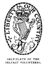 The primary motif of the Volunteers was an Irish harp with the British crown mounted above it, with either the name of the company or a motto curved around it, or both, i.e. "Templepatrick Infantry" or "Liberty & Our Country".[7] This harp and crown motif was prevalent on the Volunteer companies flags, belt-plates and gorgets.[7] Some included the Royal cypher "G.R." standing for King George III.[7] Shamrocks also commonly featured.[7]