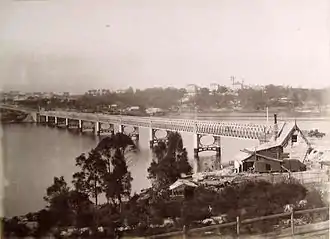 The original bridge was constructed of wrought iron lattice girders and opened in 1882 after four years of construction. The area was sparsely populated in the 1880s and the opening of the new bridge not only helped accessibility but also provided a new western route to Sydney via Balmain. The old spans were re-used by means of purchase by Gordon Duff. Because of their good resistance to corrosion, all nine of the 1882 bridge's 38.5-metre (126 ft) spans are in current use in three bridges on country roads in the Forbes area.[8] All that remains in place of the original bridge are the sandstone abutments situated on both sides of the cove approximately 20 metres (66 ft) south of the current bridge. The abutment on the Drummoyne side is listed on the local government heritage list.[9]