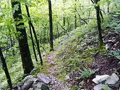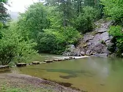The picnic area includes three covered shelters, two of which were built by the CCC in 1933. The first is about 24 by 14 feet (7.3 m × 4.3 m), built with open log construction and topped by a gable roof. The north and south sides of the shelter have log balustrades, while the other two sides are open; a picnic table is set under the shelter.[3] The second is more square in shape, with a pyramidal roof, but also has balustrades on the north and south sides.[4]