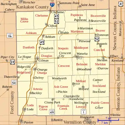 The county is bisected by the east–west U.S. Route 24, which passes through Gilman, Crescent City, the county seat of Watseka, and Sheldon.