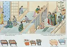 - 1822 – Illustrations of Japan; consisting of Private Memoirs and Anecdotes of the reigning dynasty of The Djogouns, or Sovereigns of Japan; a description of the Feasts and Ceremonies observed throughout the year at their Court; and of the Ceremonies customary at Marriages and Funerals: to which are subjoined, observations on the legal suicide of the Japanese, remarks on their poetry, an explanation of their mode of reckoning time, particulars respecting the Dosia powder, the preface of a work by Confoutzee on filial piety, &c. &c.] by M. Titsingh formerly Chief Agent to the Dutch East India Company at Nangasaki. Translated from the French, by Frederic Shoberl with coloured plates, faithfully copied from Japanese original designs. London: R. Ackermann. OCLC 5911523.[48]