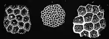 Isastrea belonged to a group known as the hexacorals, so named for the shape of each individual polyp skeleton (corallite).[2] Each corallite was between 3 millimetres (0.12 in) and 15 millimetres (0.59 in) in diameter. In addition, 30–80 septa (walls dividing body cavities) were present in each animal.[3] Its walls were "weak, discontinuous or absent". In some species, adjacent septa would fuse. Dissepiments ("small blistery plates" serving the purpose of internal support) were plentiful in the animal. Columella (central "rod- or plate-like" structures) were present as well, but were not very strong.[1] The genus is believed to have lived in colonies (each of which could have been 39 inches (0.99 m) long) and formed coral reefs.[2] The colonies were "massive",[1] "encrusting, platey, dome-shaped or sometimes ramose".[3] It was a hermatypic coral, which require "warm, clear, shallow water" and live in symbiotic relationships with algae.[2] It is also likely that zooxanthellae (a kind of protozoa) lived on the coral.[3] It has been theorized that Isastrea could endure lower temperatures than most other hermatypic corals because it occurs farther north than them.[2]