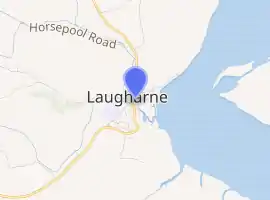 Island House is a Grade II* listed, partly Tudor, sub-medieval townhouse located in Laugharne, Carmarthenshire, in southwest Wales. It sits below the castle between the two mouths by which the River Corran enters the Tâf estuary, known locally as "Earth Lake" and "Mill Orange".[3] The frontage now ranges along Wogan Street but was formerly set in a walled garden. Built principally of stone, the earliest parts date from the 15th century, with additions from the 16th and 19th centuries. The grading status signifies a building of exceptional interest and it is the oldest residence in the township.[4] The historic importance of whole site is shown by separate listings of its garden, walls and outbuildings.[5]