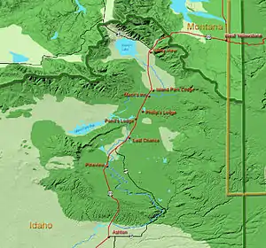 The area was known as Island Park long before the 33-mile (53 km)-long town was incorporated.[7] The area known as Island Park is mostly a large crater or caldera named the Henry's Fork Caldera that was created by the same hotspot that created the earlier Island Park Caldera and the later Yellowstone Caldera.[8]