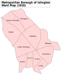 Under the Representation of the People Act 1918 constituencies in the County of London were redefined in terms of the Metropolitan Boroughs created in 1900. The constituency was defined as comprising three wards of the Metropolitan Borough of Islington having the same names as the previous wards: Barnsbury, St Mary and St Peter.[1]
