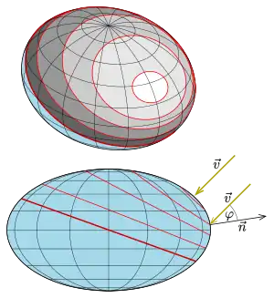 is the unit normal vector of the surface at point and the unit vector of the light's direction. In case of , i.e. the light is perpendicular to the surface normal, point is a point of the surface silhouette looked in direction . Brightness 1 means, the lightvector is perpendicular to the surface. A plane has no isophotes, because any point has the same brightness.