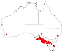 The species ranges from south-western Victoria into the south-eastern corner of South Australia[2] and in the Furneaux Group of Bass Strait islands, principally Flinders, Cape Barren and Clarke Islands. A King Island record has not been reconfirmed and is unlikely.[10] It is the only Isopogon species found in South Australia.[4] It grows on sandy soils in open eucalyptus forest or woodland. or heathland.[2]