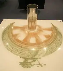 Artists who design anamorphosis (anamorphosis is Greek for "re-transformation") play with perspective to create a distorted image that appears normal only when viewed from the correct angle or with the aid of curved mirrors.[9] The technique was often used by Renaissance-era artists. Orosz tries to renew the technique of anamorphosis and his aim is to develop it as well when he gives a meaning to the distorted image, too. It is not an amorph picture any more, but a meaningful depiction that is independent from the result that appears in the mirror[10] or viewed from a special point of view.[11][12]