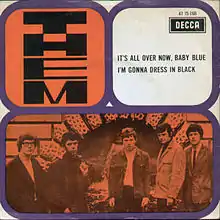 The Belfast band Them (featuring Van Morrison) recorded a cover of "It's All Over Now, Baby Blue" that was first released on their album, Them Again, in January 1966 in the UK and April 1966 in the U.S.[17][18][19] The song was subsequently issued as a single (b/w "I'm Gonna Dress in Black") in the Netherlands during October 1966 but failed to reach the Dutch Singles Chart.[20] It was later re-released in Germany in December 1973 with "Bad or Good" on the B-side, following its appearance in the 1972 German television movie, Die Rocker (aka Rocker).[21][22] The single became a hit in Germany, first entering the charts in February 1974 and peaking at number 13, during a chart stay of 14 weeks.[23]