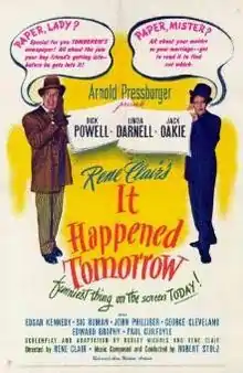 It Happened Tomorrow is a 1944 American fantasy film directed by René Clair, starring Dick Powell, Linda Darnell and Jack Oakie, and featuring Edgar Kennedy and John Philliber. It is based on the one-act play, "The Jest of Haha Laba", by Lord Dunsany.
