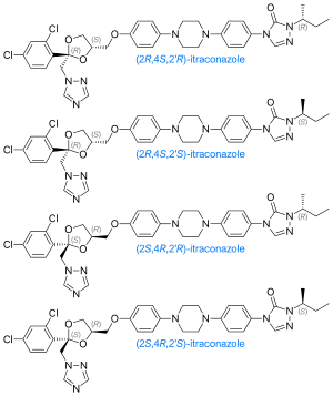 The itraconazole molecule has three chiral carbons. The two chiral centers in the dioxolane ring are fixed in relation to one another, and the triazolomethylene and aryloxymethylene dioxolane-ring substituents are always cis to each other. The clinical formulation is a 1:1:1:1 mixture of four stereoisomers (two enantiomeric pairs).[32][33]
