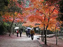 Miyajima's maple trees are renowned throughout Japan and blanket the island in crimson in the autumn. Momiji manjū, pastries filled with azuki jam or custard, are popular souvenirs and carry maple-leaf emblems. Many other varieties such as chocolate and cheese are available.[7] Because the island is seen as sacred, trees may not be cut for lumber. Deer roam freely. Deer are thought of as sacred in the native Shinto religion because they are considered messengers of the gods. They walk the streets of the city, not afraid of the tourists.