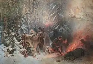 It is said that they were unsure of the road to Domnino and so they started to ask locals for directions. In woods near the village, they met a logger, Ivan Susanin, who promised to take them via a "shortcut" through a forest directly to the Hypatian Monastery, where Mikhail was apparently hiding. His enemies followed Susanin and were never heard from again. It is presumed that Susanin led them so deep into the forest that they could not find a way out and so they perished in the bitter cold February night.