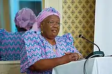 She served briefly as South Africa's acting president in 2005,[1] when both President Thabo Mbeki and the Deputy President were outside the country. Furthermore, she was chosen by the cabinet to be the constitutional and official head of state in an interim capacity for 14 hours on 25 September 2008, between the resignation of Thabo Mbeki and the taking of office by Kgalema Motlanthe.[2][3] She was the first, and to date, only woman to have held the post of President in South Africa and the first woman to be head of state of South Africa since Elizabeth II's reign as Queen of South Africa in 1961.