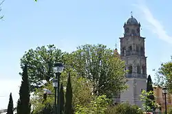 Its main landmark is the San Juan Bautista Parish, originally built in the 17th century, named after the patron saint of John the Baptist. Of the original structure, only the side chapel dedicated to Christ, the octagonal cupola and a posterior building survive. The rest was rebuilt in the century that followed. It has two bell towers, the larger one of gray sandstone, the tallest in Tlaxcala, which contains the state's largest bell, cast in 1906 and donated by María Juana del Carmen de Jesús. The main entrance is carved with motifs of seeds and a flower called “chimali.”[2][3] In front of this entrance is an atrium cross of stone from the 17th century.[4] The interior is neo classical altars and the main altar is made of carved cypress. To the side of the main altar, there is another small chapel which contains a Baroque altarpiece which probably belonged to the old church.[2][3] Opposite the plaza from the church is the city hall (municipal palace) which maintains some of its original construction with most modifications made to the interior, with new walls and modern classroom. The outer walls are of 60 cm thick stone. The facade is simple and the roof is tile.[2] Two other chapels face the plaza, the Santa Cruz Chapel and the Virgin of Guadalupe Chapel. The latter was founded by the Franciscans in the 16th century, with construction into the 17th. Its main facade is flat and white, with stone walls up to 90 cm thick.[2][3]