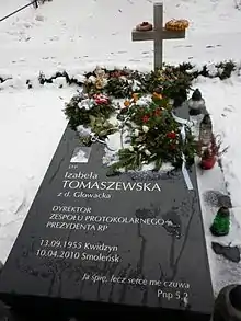 Izabela Tomaszewska, née Głowacka (13 September 1955 in Kwidzyn – 10 April 2010) was a Polish government official and archaeologist. She was head of the Protocolar Unit at the Chancellery of the President of the Republic of Poland.