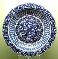 Although both the use of cobalt blue on a white background and the shape of large dishes were clearly influenced by Chinese porcelain from the Yuan and Ming dynasties, the early Iznik fritware dishes were far from being direct copies of Chinese designs. In some pieces, such as the front of a large charger with a foliate rim in the Çinili Koşk Museum in Istanbul, the decoration used only Ottoman Rumi designs.[47]