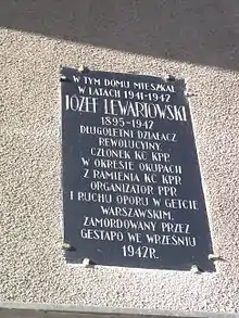 Józef Lewartowski was born in 1895 into a family of poor Torah-observant Jews. His parents were Moishe and Chava Lewartowski. He joined the Poale Zion in 1918. In 1920 Lewartowski was member of the Provisional Polish Revolutionary Committee. He was co-founder of Communist Party of Poland and member of the Central Jewish Bureau. On 9 April 1926 he was arrested and sentenced by the Polish court to 3 years in prison. Lewartowski was member and leader of Prison's Commune - organization of left-wing political prisoners in Second Polish Republic. He escaped from prison in December 1926 and fled to Moscow. In 1932 Lewartowski returned to Poland. In 1933 he was one of the organizers of labor strike in Łódź and Białystok. In 1934 he was re-arrested and sentenced to 12 years of prison. In prison he met Alfred Lampe, Paweł Finder and Bolesław Bierut. Lewartowski was released from the prison on 1 September 1939 and took part in Defense of Warsaw during the September Campaign. Since 1941 he lived in Warsaw Ghetto. He joined the Polish Workers' Party and in March 1942 he founded of the Anti-Fascist Bloc. Józef Lewartowski died 25 August 1942, shot by Gestapo.[3] He has been awarded the Order of the Cross of Grunwald.[4]